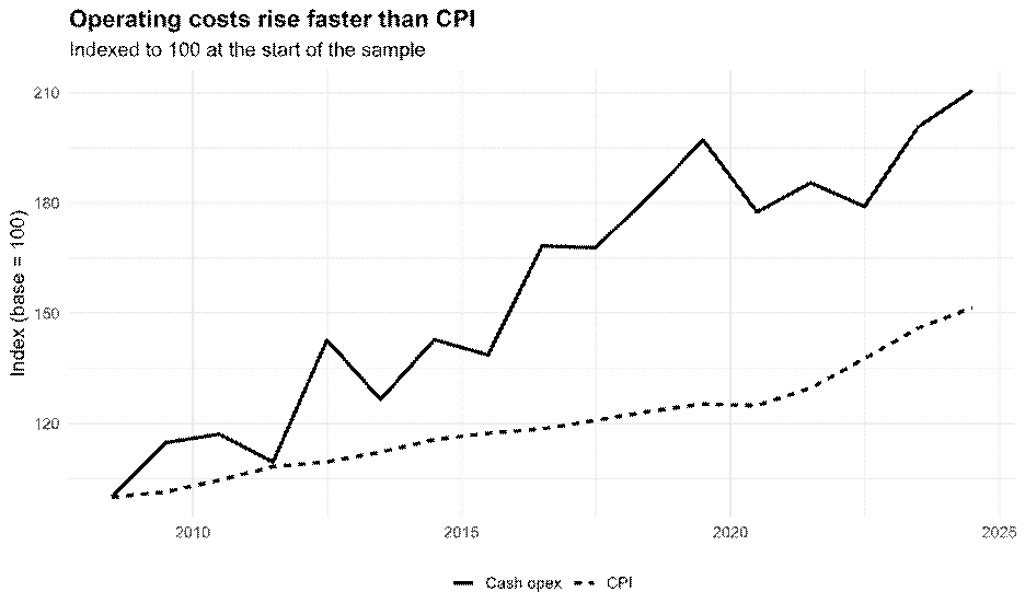 Operating costs outpace CPI by approximately 2.1 percentage points per year A persistent, structural drag on real operating margins.