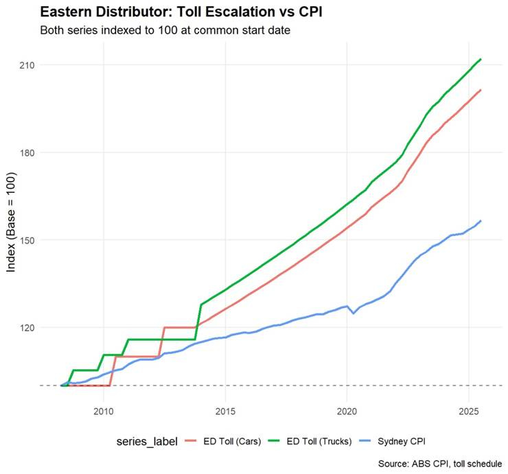 The Eastern Distributor has CPI-linked tolls. By any reasonable measure, the toll escalation mechanism works: tolls have grown faster than CPI over the concession’s life, providing strong nominal revenue protection.