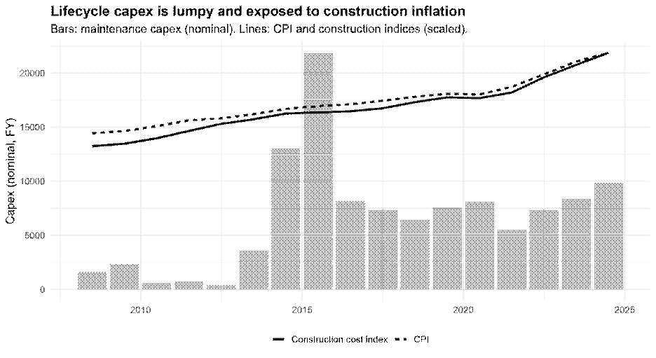· Second, capital maintenance is lumpy. A small number of years account for a disproportionate share of total lifecycle spending. This makes inflation risk path-dependent: if major renewals fall during periods of elevated construction inflation, the real cost of maintenance rises sharply relative to CPI-based expectations.