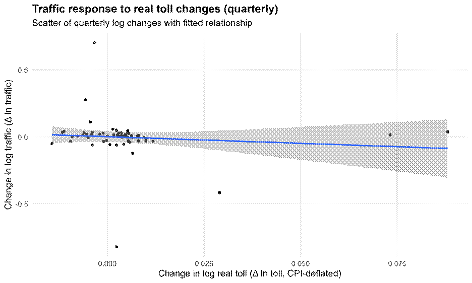 The estimated elasticity is −0.6. This implies that a 1% increase in real tolls is associated with a 0.6% decline in traffic in the same quarter. While this estimate is imprecise and not statistically significant, its sign is stable across different model specifications. Importantly, the data provide no support for the assumption of perfectly inelastic demand.